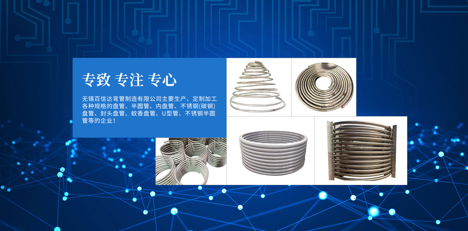 無錫百信達彎管制造有限公司位于經(jīng)濟發(fā)達、風景秀麗的太湖之濱。本公司擁有完整、科學的質(zhì)量管理體系,公司的誠信、實力和產(chǎn)品質(zhì)量獲得業(yè)界的認可。公司專注生產(chǎn)、定制加工各種規(guī)格的盤管、半圓管、內(nèi)盤管、不銹鋼盤管、封頭盤管、蚊香盤管、U型管、不銹鋼半圓管、碳鋼盤管等的企業(yè)。本公司設計加工的彎管設備,質(zhì)量精良、結(jié)構合理,效率高、操作簡易、經(jīng)久耐用。公司已經(jīng)承接了各地多個大型場館工程項目的彎管加工,屢次得到了多家大客戶的好評。努力滿足客戶的需要,不斷提高自身水平是公司追求的目標。歡迎社會各界朋友蒞臨無錫百信達彎管制造有限公司參觀、指導和業(yè)務洽談!